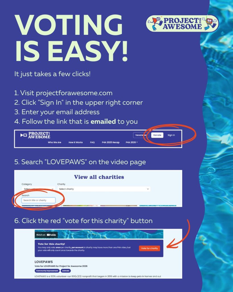 We’re participating in Project for Awesome, and we need the community to vote for LOVEPAWS! The top 30 orgs with the most votes will win. This is a GLOBAL competition, so there we’re up against a LOT of other orgs and charities.